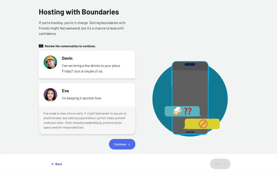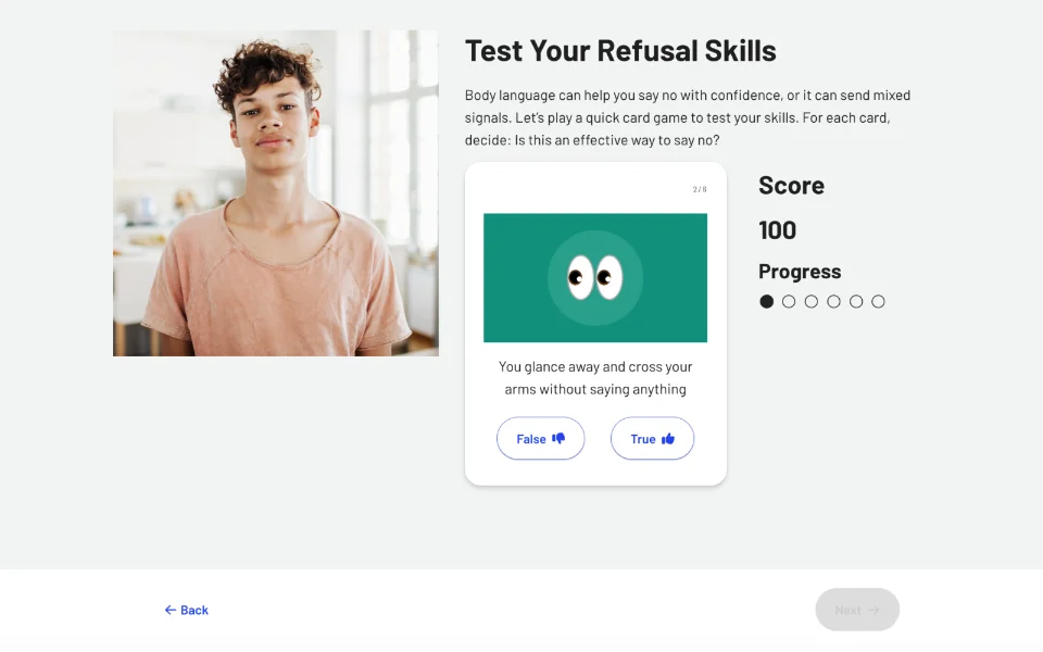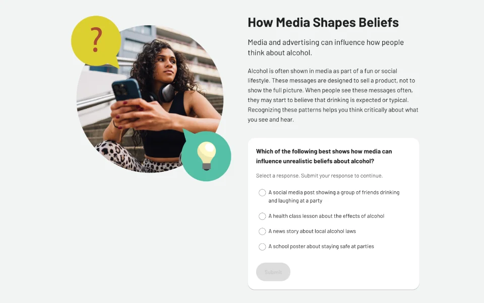 Alcohol Education: Safe and Smart is a newly updated health and wellness course that takes a public health approach to preventing alcohol abuse and is designed to scaffold students’ understanding of how to address difficult alcohol-related scenarios. Through interactive real-world scenarios, students learn how to leverage their personal values and goals, resist peer pressure, and step in when they see someone who may be in trouble. The course has been refreshed to build on the foundation of the original course while delivering greater depth, stronger skill-building, and expanded standards alignment to better support student success.