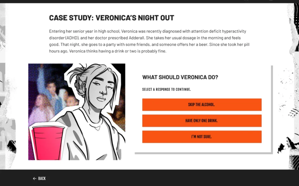 Students guide characters to make smart choices regarding prescription drug use, which is not always harmful but has the potential to be misused.