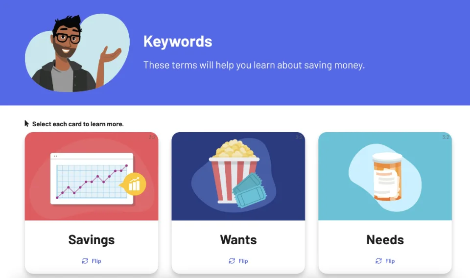 Students will recognize how a savings account can help them reach their financial goals including learning what a savings account is, how savings accounts work, the benefits (FDIC, interest), and how to plan for real life/crises.