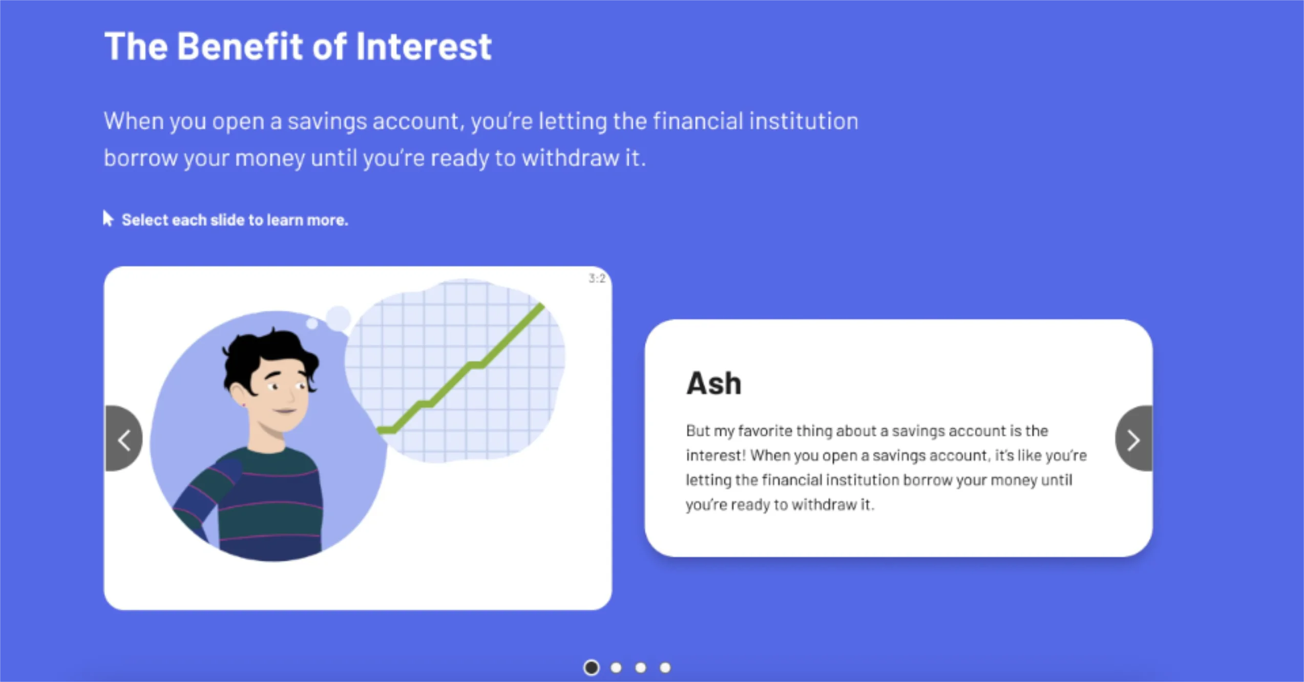 Starting out in life with a strong financial literacy foundation is crucial to students’ long-term success. This is why we have created a free interactive, digital course called SaveUp. Through engaging self-paced lessons, middle school students are provided with the knowledge and skills they need to become informed consumers on how to save money, thus prompting them to begin saving as early as possible. In this course, students will learn why saving is important, how to budget and spend wisely, how to build an emergency savings, why savings can help reach financial goals, setting short-, mid-, and long-term goals and how to open a savings account.