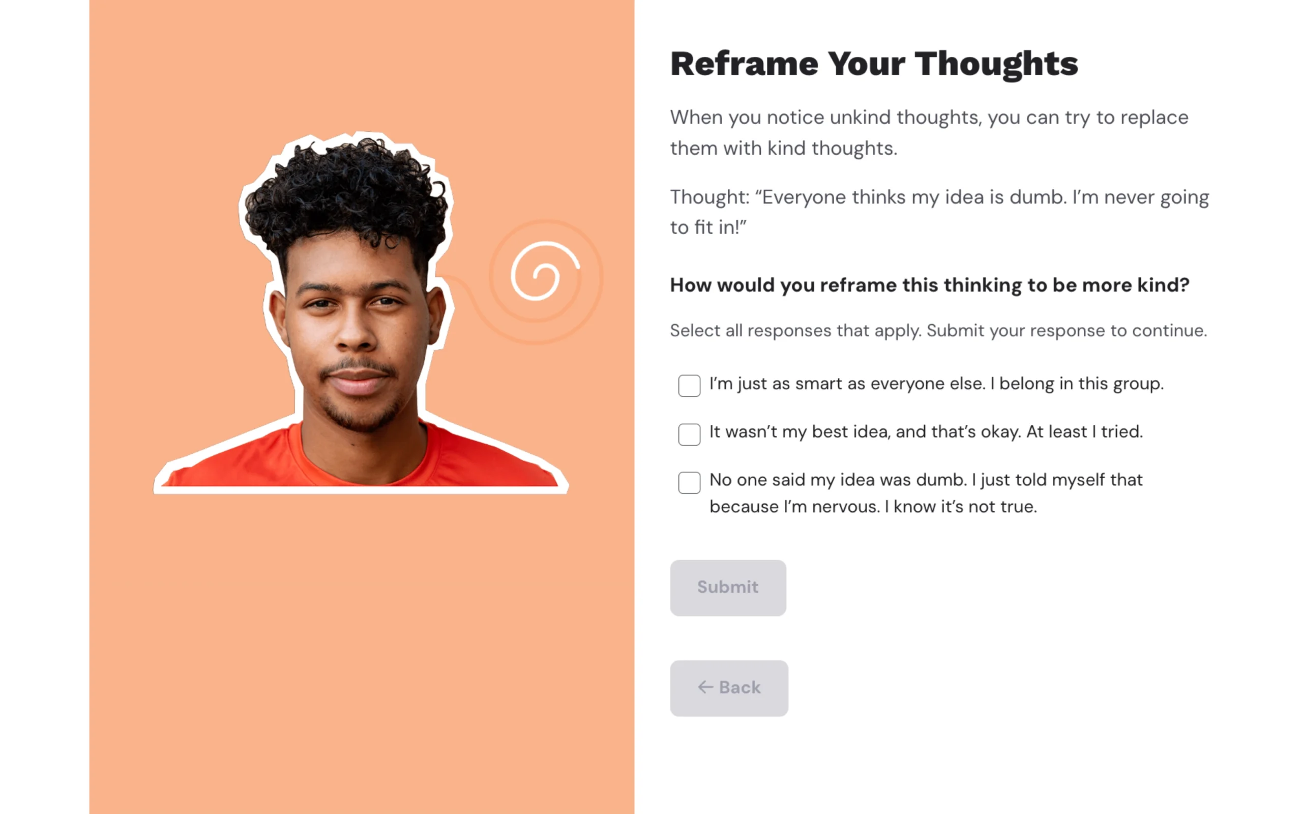 Students learn what coping strategies are and how they can be used to deal with life’s challenges and support mental health. Students also have the option to practice five coping strategies.