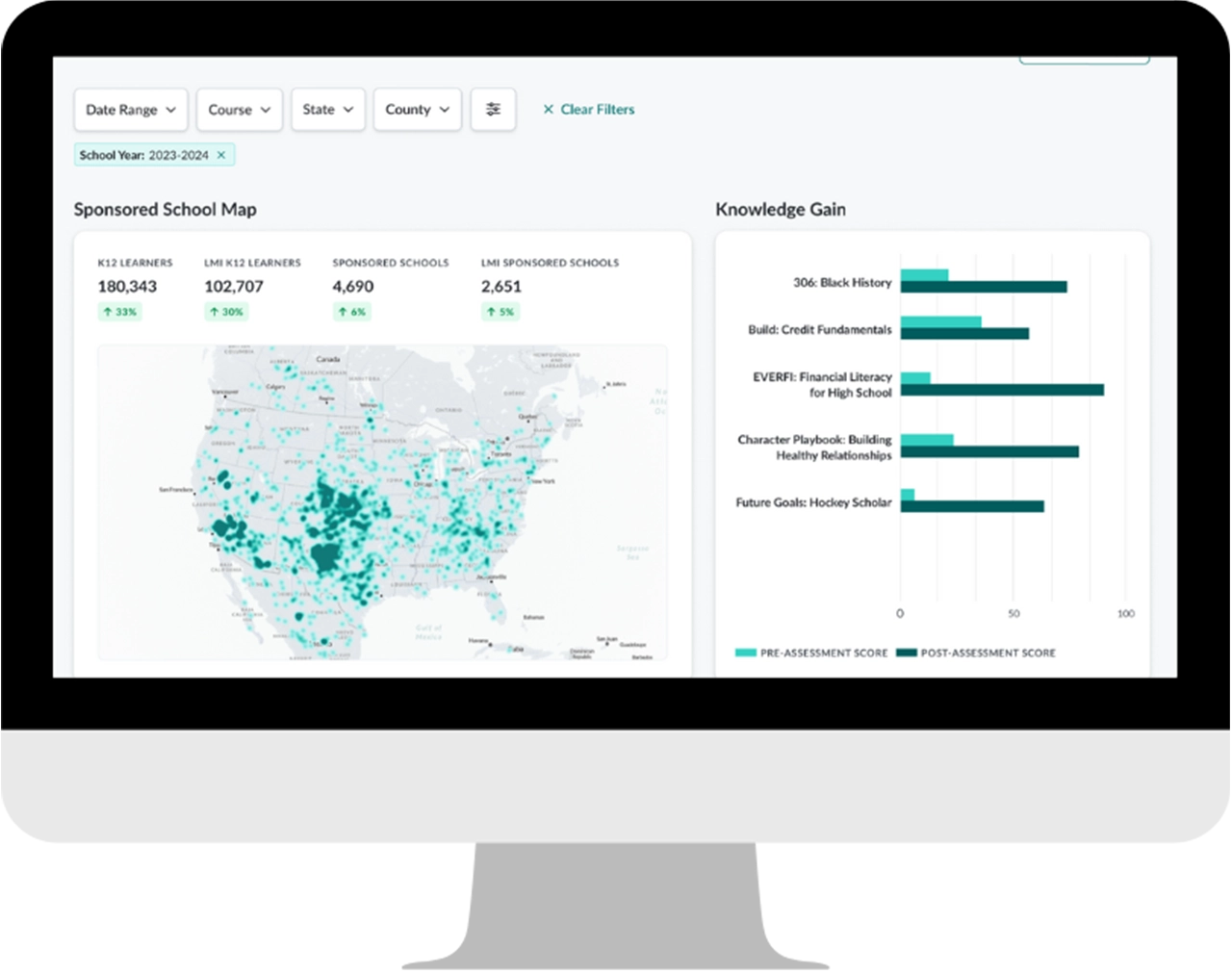 Everfi’s robust library of standards-aligned content, developed by subject matter experts, makes learning essential skills such as financial literacy and health and wellness easy and accessible. Our customizable platform puts your brand front and center for teachers and students.
